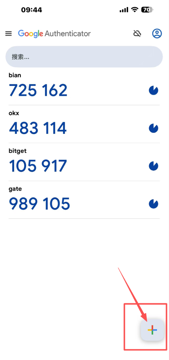 3.打开谷歌验证器,点击右下角彩色加号,选择输入设置密钥,或者扫描二维码,如图