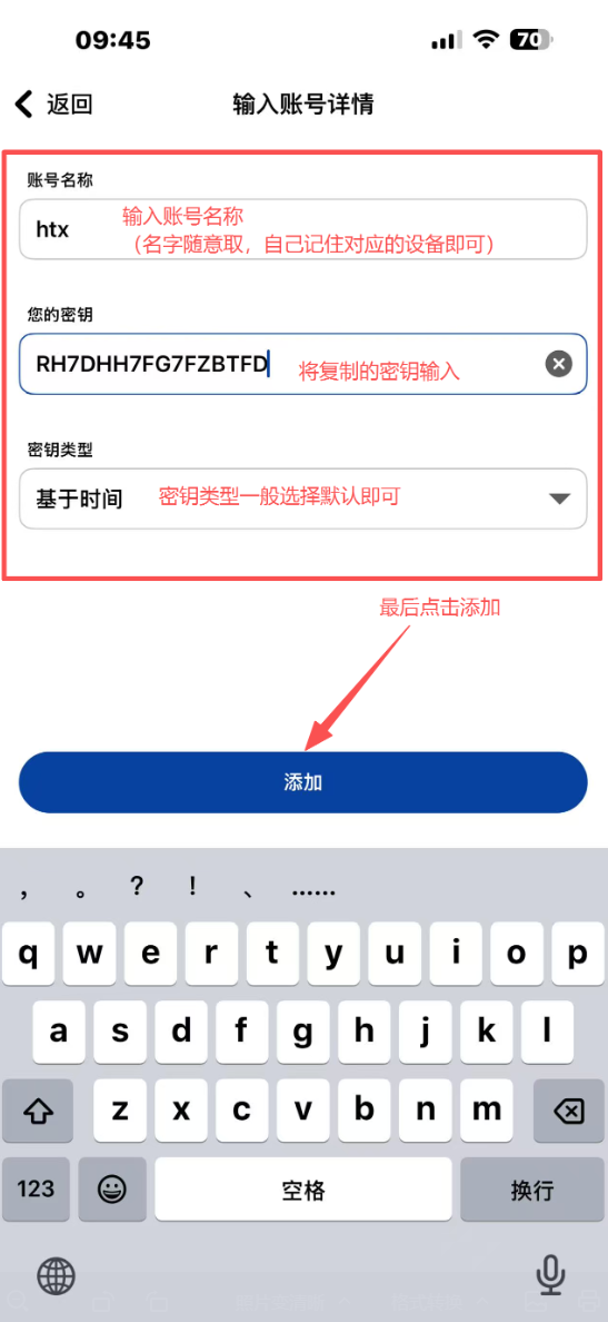 4.进入【输入账号详情】,依次输入账号名称、你的密钥和密钥类型,最后点击添加,如图