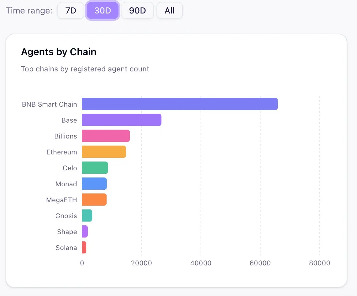 而 BNB Chain 链上 AI 智能体数量已激增至逾 68,991 个,占全网份额超 40%,成为全球 AI 智能体部署量第一的公链网络,远超 Ethereum 和 Base 等竞争对手。