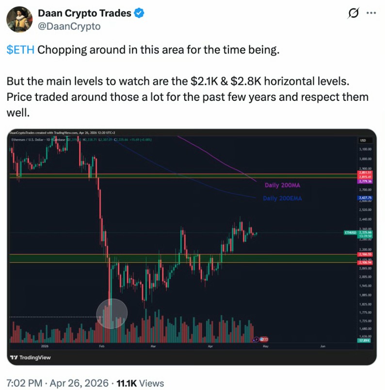 在X平台上的一篇最新帖子中,交易员Daan Crypto Trades表示,需要重点关注的几个关键价位分别是:2100美元作为支撑位,以及2800美元的阻力位——过去几年里,以太坊价格一直很好地“尊重”了这一阻力水平。