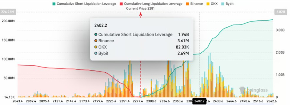 与此同时,以太坊的清算地图显示,若价格突破2,400美元,将触发全交易所超过19.4亿美元的空头清算。