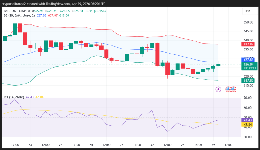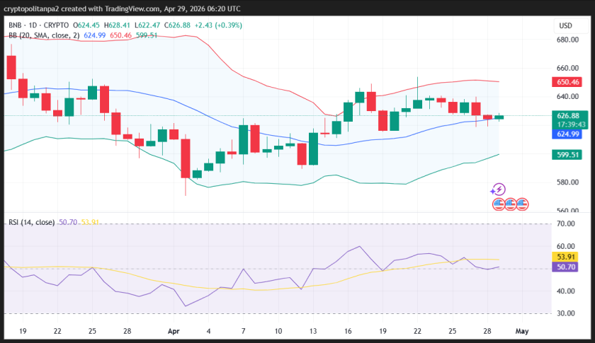 截至2026年4月29日,币 Binance 呈现上涨趋势。随着多头积极测试近期阻力位,价格正在回升。价格分析显示,在经历回调后,BNB今日在624美元附近获得支撑。目前 BNB 交易价格为626.88美元,过去24小时内上涨0.2%。