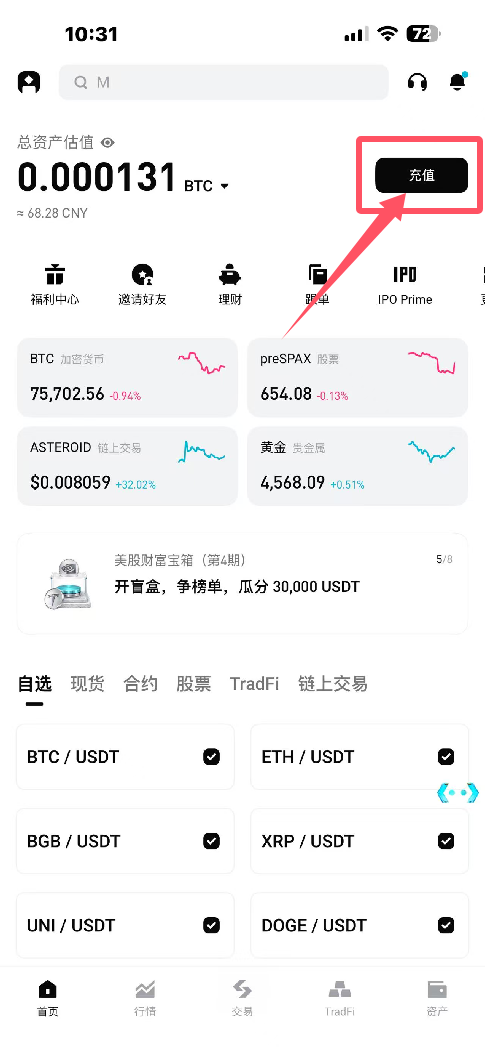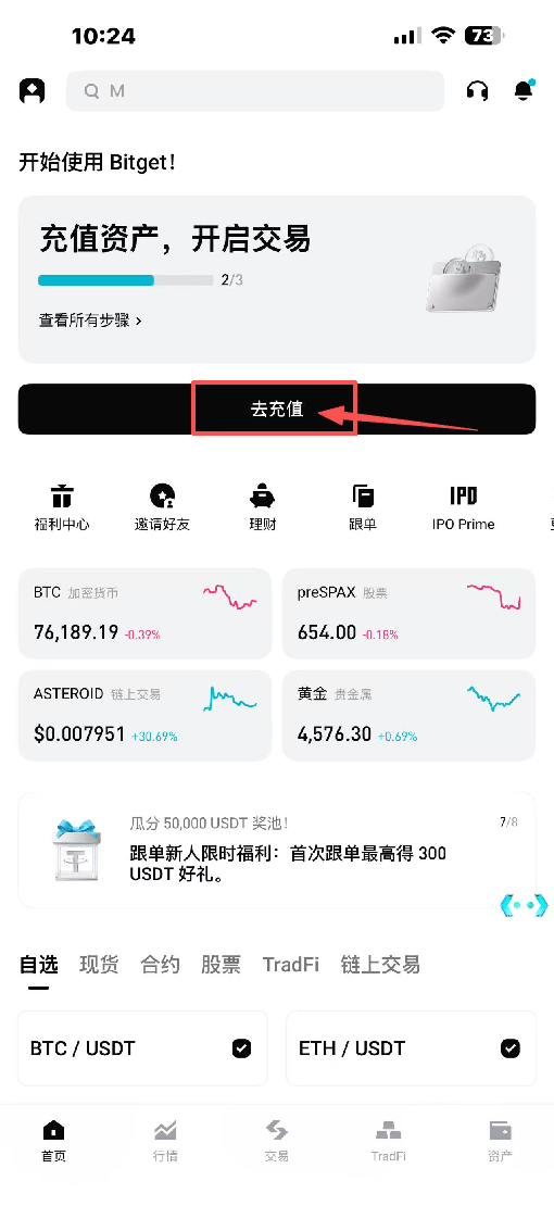 1.打开BITGET APP,点击首页的充值,如图