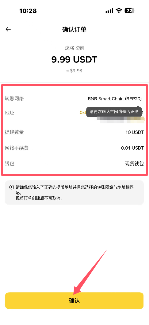 25.确认下金额、地址、网络,点击确定,如图