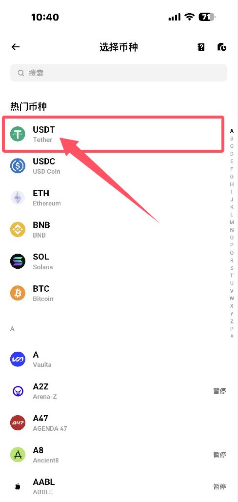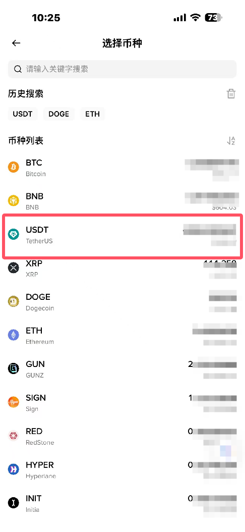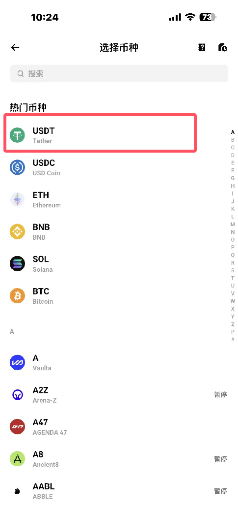 3.选择需要充值的币种,我们以USDT为例,如图