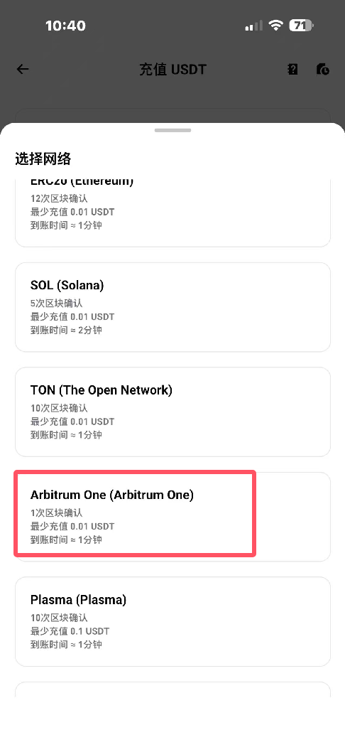 21.选择网络:网络必须一致:充值选Arbitrum,提币也要选Arbitrum,如图