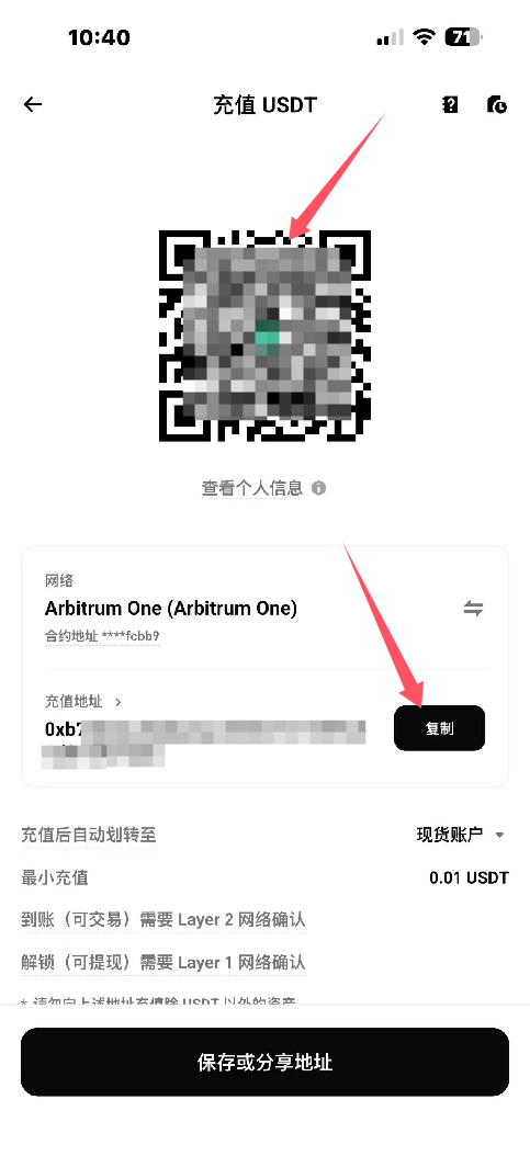 5.复制我们的BITGET链上地址,或者扫描二维码,如图