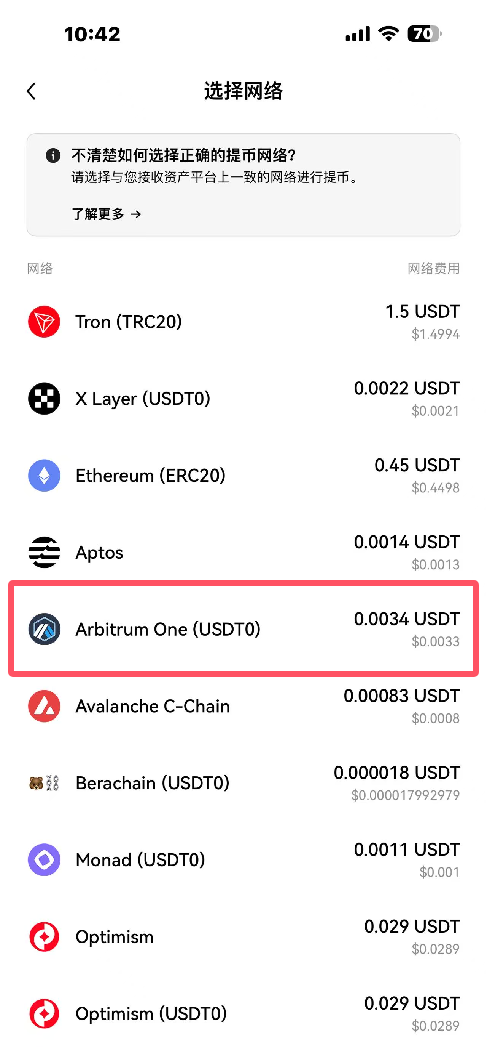 最简单就是记住:币安转出用BEP-20免费,欧易转出用Arbitrum只要几分钱。其他网络都比较贵,能不用就不用。