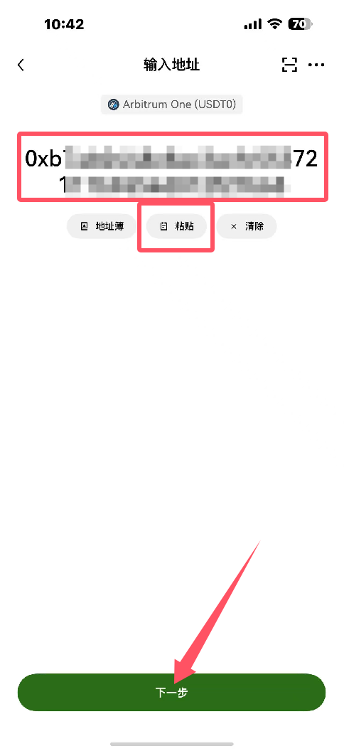 22.将之前复制的BITGET地址粘贴,点击下一步,如图