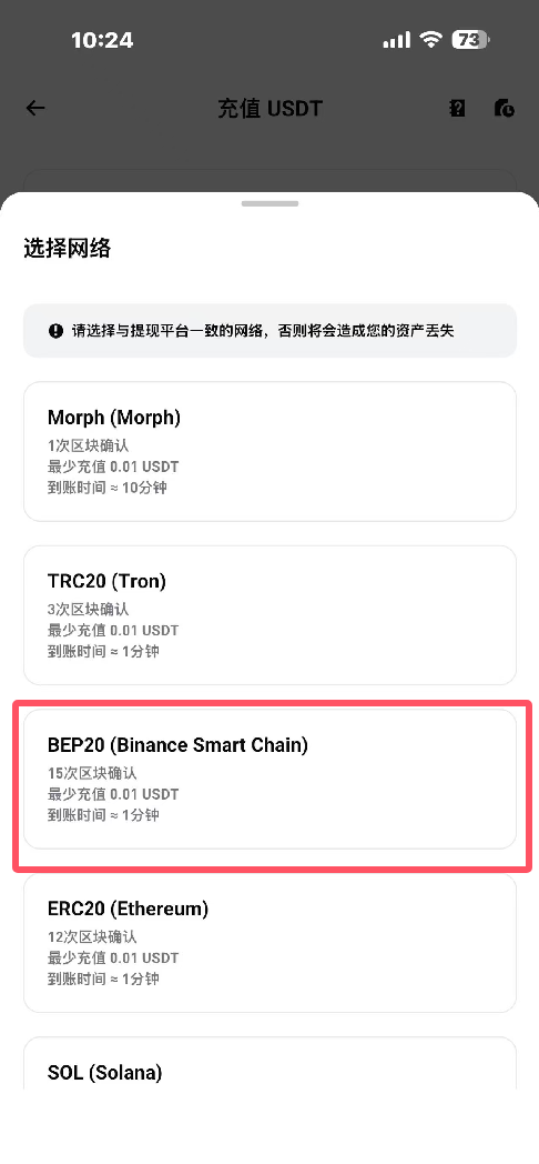 - 网络必须一致:充值选BEP-20,提币也要选BEP-20