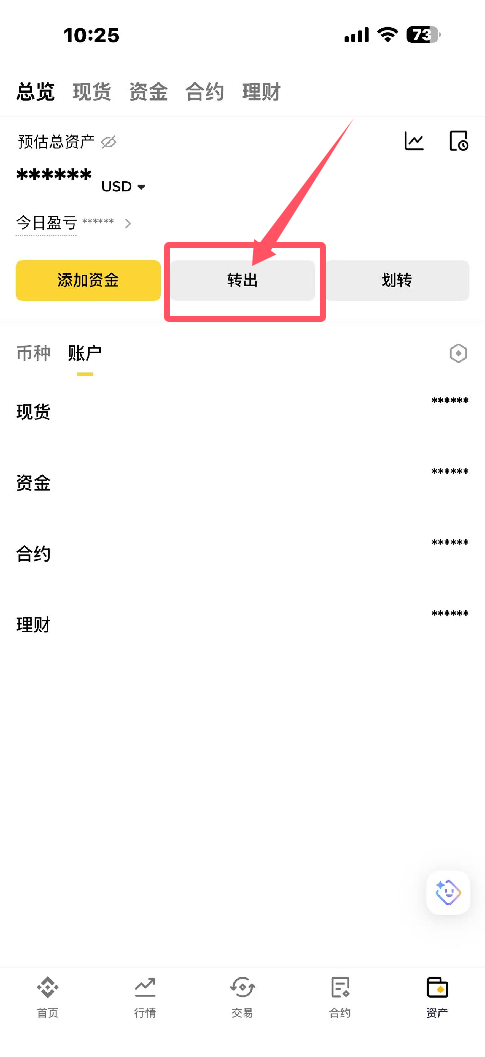6.然后打开币安交易所,在资产界面点击转出,如图