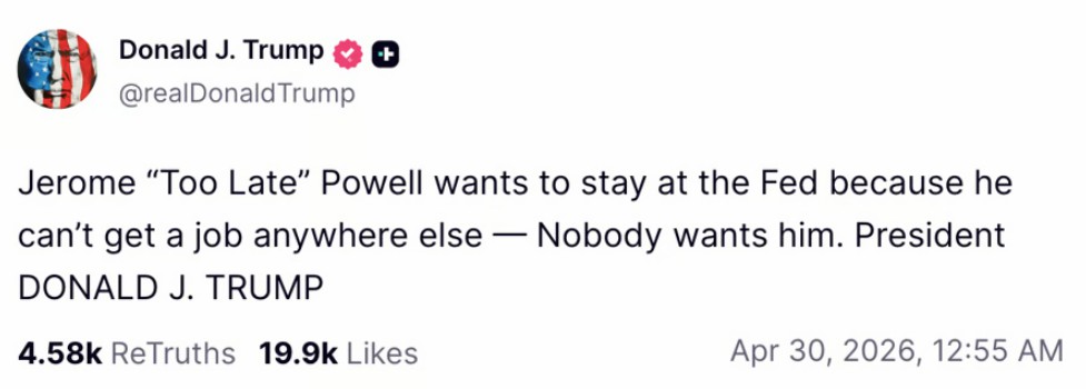 特朗普在决议后再次猛烈抨击鲍 威 尔,称他在可能由凯文·沃什接任之前降息“为时已晚”。
