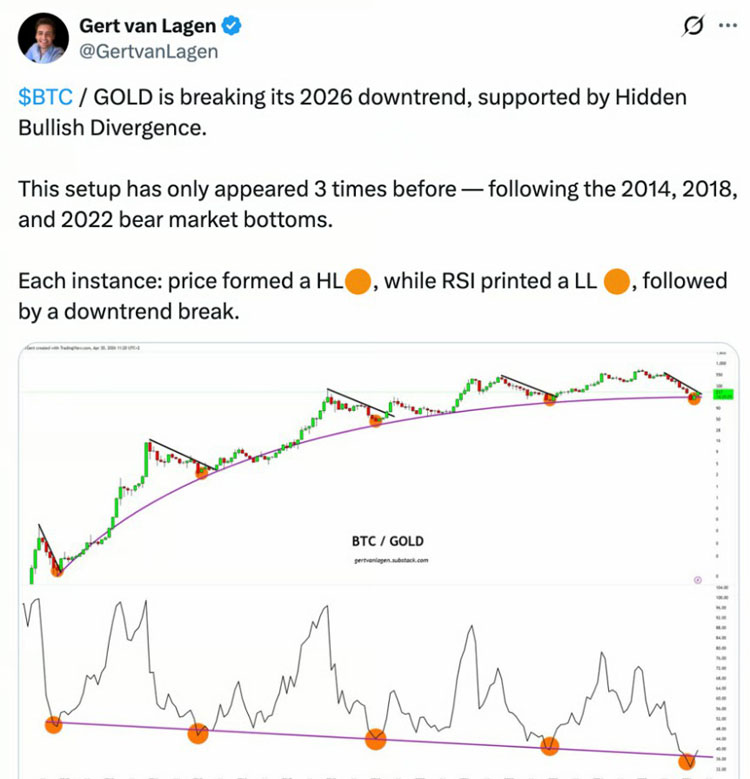 - 自3月以来,BTC兑黄金已上涨近40%,此前曾连续七个月下跌。