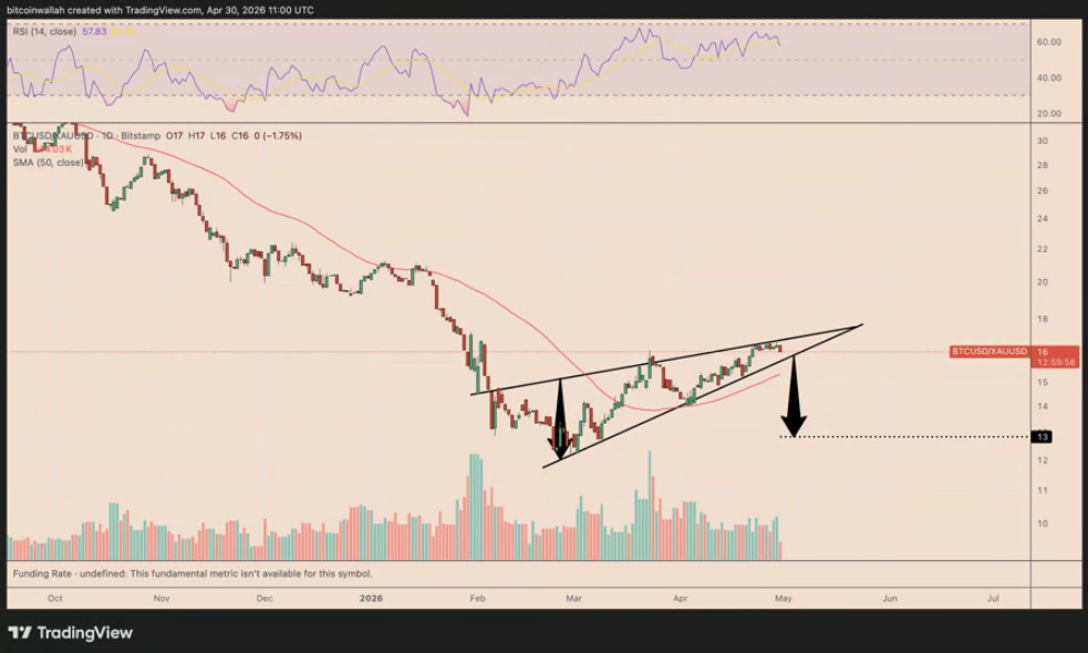 看跌反转形态显示,比特币以黄金计价的价值可能下跌20%,这一跌幅基于楔形形态的测量幅度。