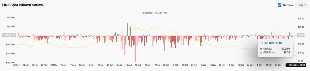 8 月 18 日,LINK 链上现货净流入量为负,约为 -890 万美元,证实了投资者在较高价位进行了小幅抛售。此次资金流出与 26 美元的回调相符,表明目前的获利回吐超过了新增持仓。