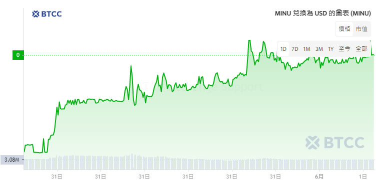 截止5 月31 日,Minu 的价格徘徊在0.0000003 美元附近,其市值为$1,884,926,在加密货币中排名1691。