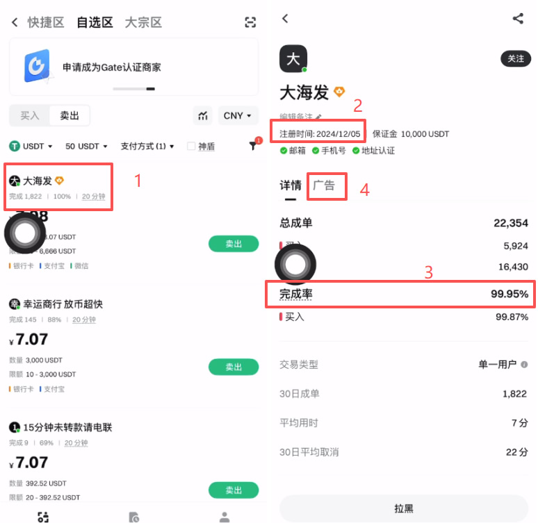 C2C交易平台(包括Gate.io的C2C)会提供买家信用评价,选择信誉好的买家。