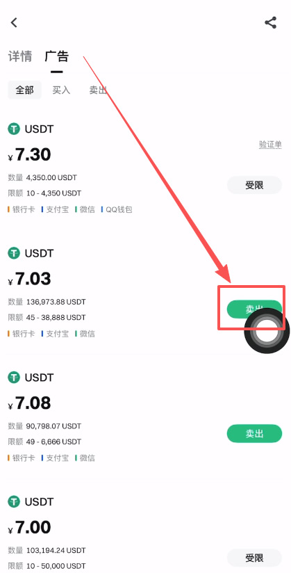 在上方选择自选区,就是个人对个人交易。点击【卖出】,要出售的币种就是USDT。然后可以筛选一下数量,比如说50U。后面可以选择一下支付方式,比如说你想提现到银行卡,我们就可以勾选银行卡。