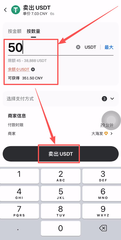 再次输入一下要出售的数量或者是金额,比如说我出售50个USDT,会为我们算出来将收到351.5人民币。点击下方的【卖出USDT】就好了。