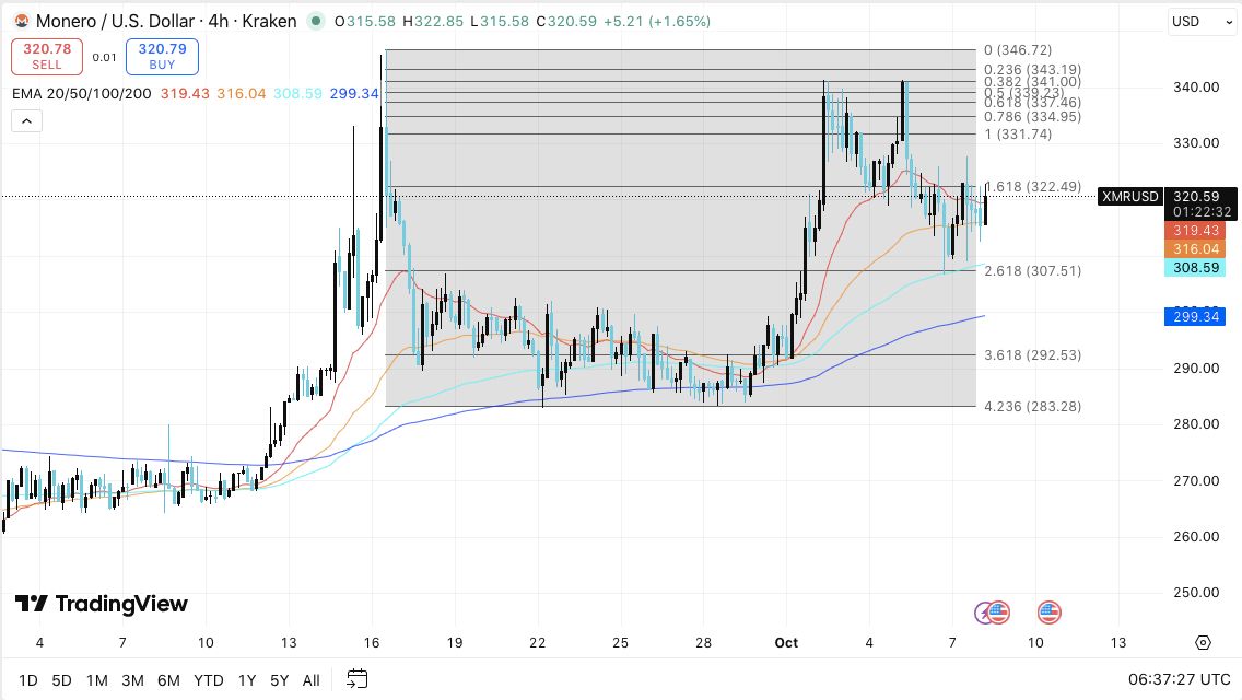 4 小时图上的 XMR 价格走势显示在 300 美元区域附近获得持续支撑。20 日指数移动平均线 (EMA) 位于 319 美元,而 50 日 EMA 位于 316 美元附近,两者均充当动态支撑位。