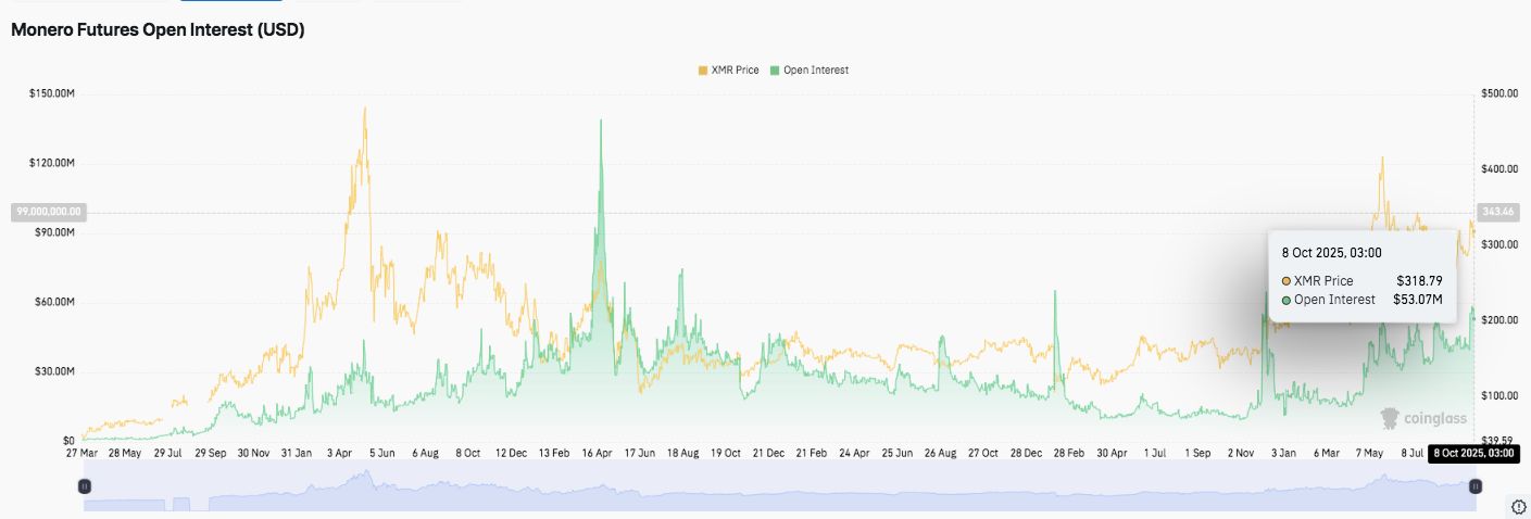 XMR 的期货未平仓合约趋势反映了 2024 年和 2025 年交易者活动的波动。未平仓合约在 2025 年初达到峰值,接近 1.2 亿美元,表明投机参与度强劲。