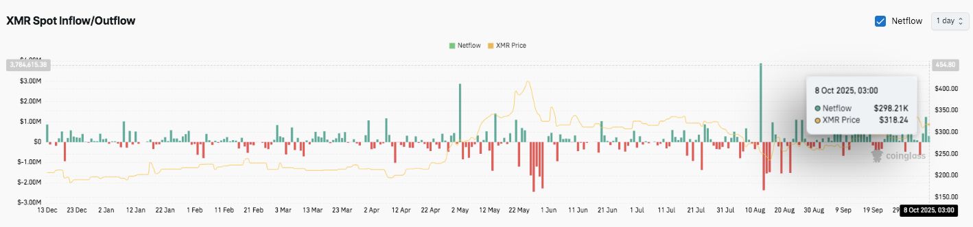 值得注意的是,8月份净流入近380万美元,与此同时,购买压力再次出现。截至10月8日,门罗币录得29.8万美元的温和净流入,表明市场正在温和增持。