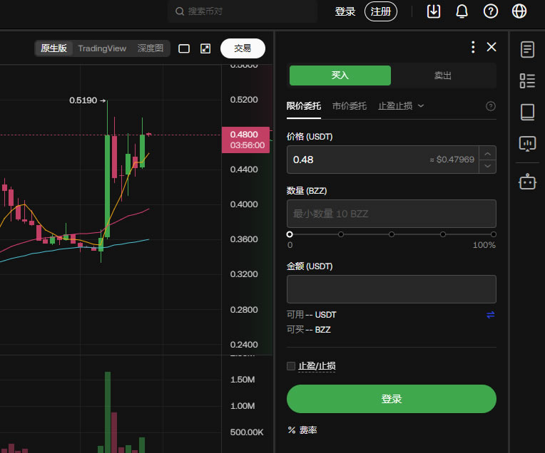11、在搜索框输入BZZ,选择BZZ/USDT交易对,可以看到BZZ实时行情