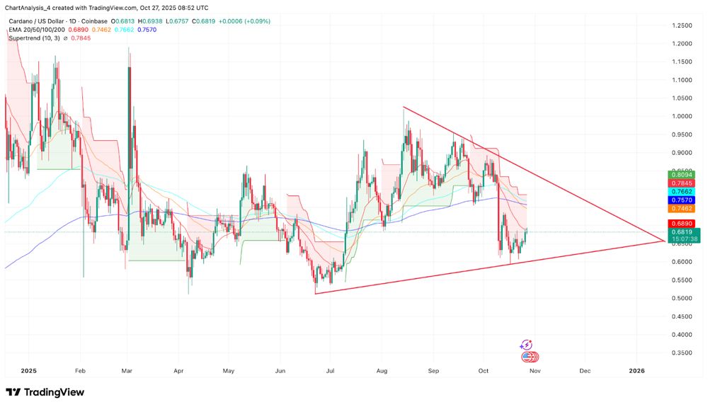 艾达币(ADA币)今日价格接近 0.6819 美元,自 10 月份低点 0.65 美元反弹后,目前维持在稳定状态。该代币继续在一个收紧的对称三角形内交易,多头和空头都在等待一个决定性的突破,这可能决定其 11 月的下一个重大走势。