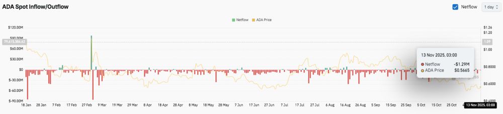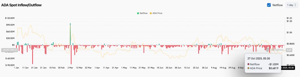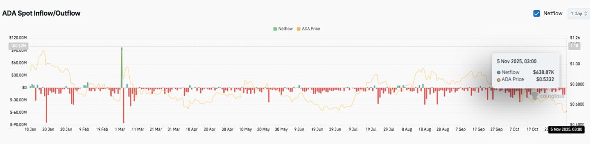 Coinglass 的数据证实了持续的资金外流。截至 10 月 30 日,ADA 的净流出资金达 94 万美元,连续三周下跌,累计跌幅超过 2500 万美元。现货交易所持续的负值表明,反弹行情中吸筹资金减少,流动性也随之减弱。