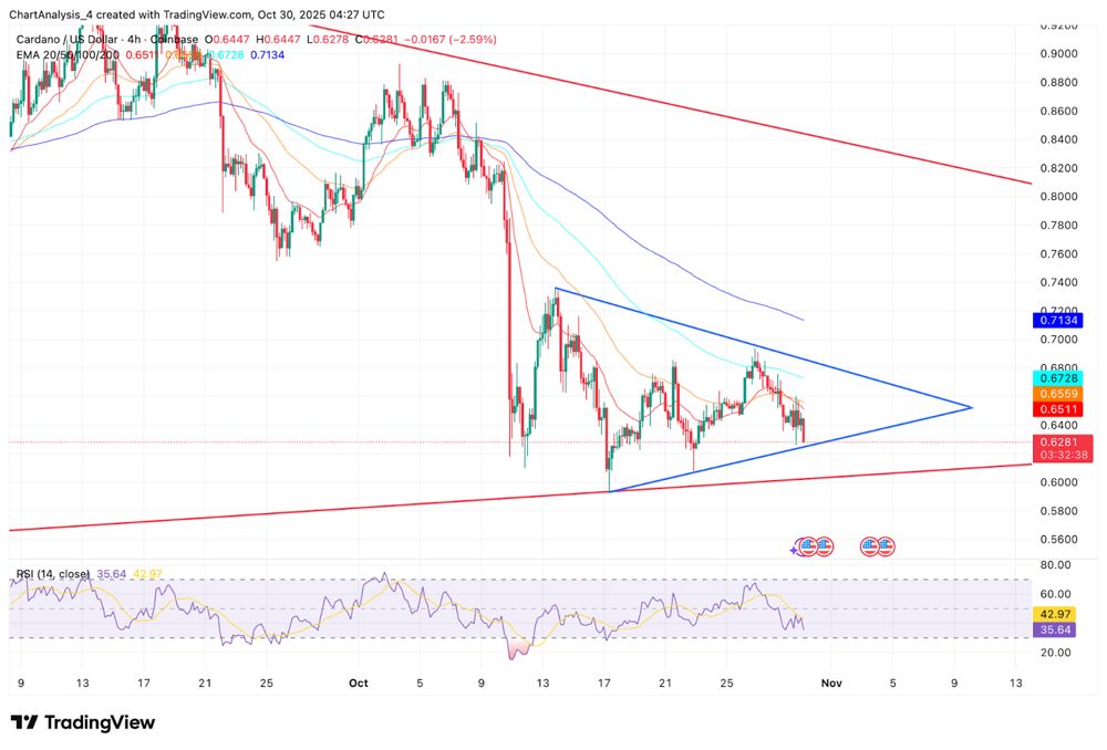 4 小时图显示,ADA 价格被限制在 0.62 美元至 0.68 美元之间,处于一个对称三角形内。20 日均线位于 0.65 美元附近,50 日均线位于 0.67 美元附近,100 日均线位于 0.71 美元附近,这些均线都位于价格上方,确认了短期承压。