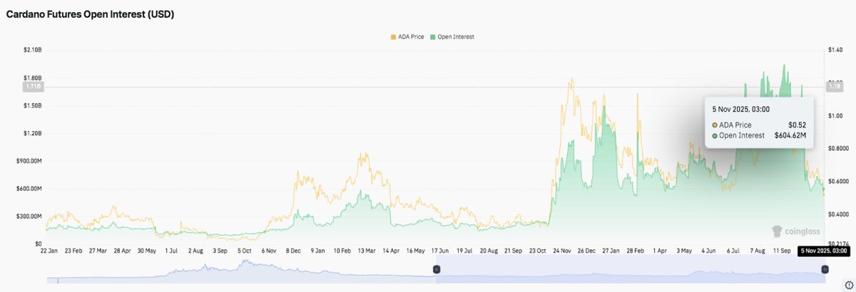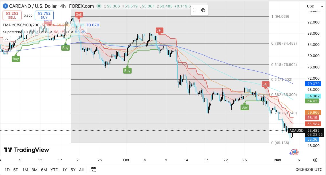 ADA目前交易价格在0.534美元左右,远低于关键移动平均线。这种持续疲软反映了整体市场放缓的趋势,因为交易者正在平仓杠杆头寸,并且山寨币市场情绪降温。