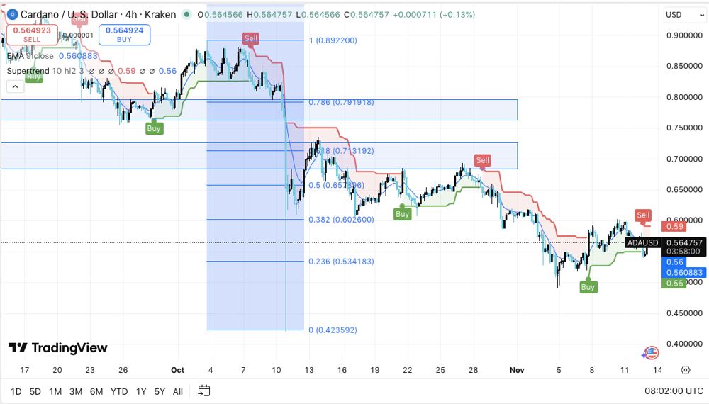 技术面显示,ADA 正在 0.555 美元附近尝试形成更高的低点,但仍处于更广泛的低点-高点走势中。价格目前被挤压在超级趋势阻力位和 0.560 美元附近的支撑带之间,这种形态通常预示着方向性扩张即将到来。一旦价格突破这一结构,就可能引发方向性或反向的剧烈波动。