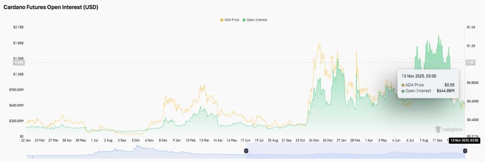 Cardano 的期货市场活跃度较年初有所增强。自 10 月下旬以来,未平仓合约量已从近 3 亿美元攀升至超过 6.4 亿美元。此外,这一增长发生在价格徘徊在 0.55 美元附近时。