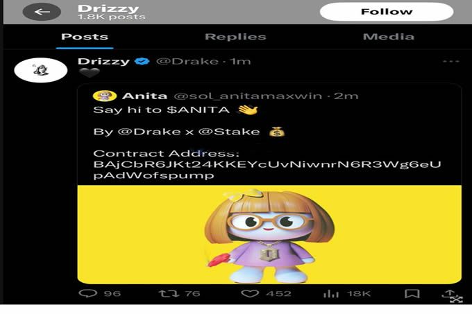 Drake的推特于12/16出现一连串贴文,内容主要在推广一款名叫$ANITA的Meme币,并声称$ANITA与加密博弈平台Stake合作推出。然而Stake正是Drake本人使用的知名博弈平台,让假消息增添几分可信度。
