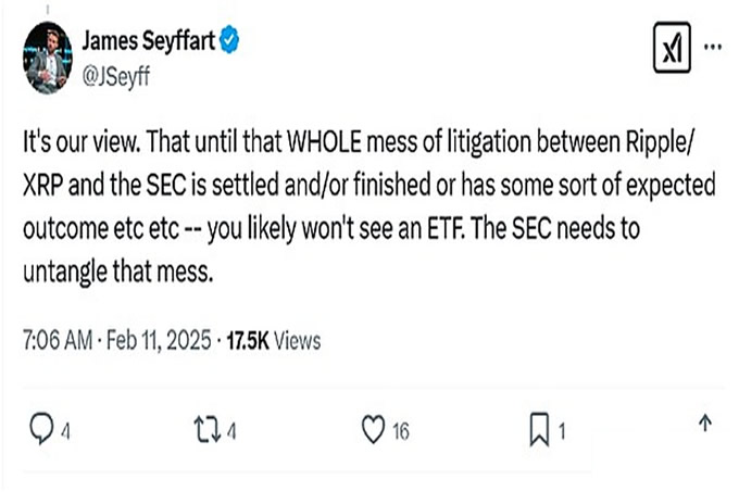 与此同时,Solana 和 XRP 的安全状态仍存在疑问,Seyffart 预测,在美国证券交易委员会对 Ripple 的诉讼完全解决之前,XRP ETF 不会获得批准。