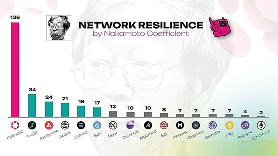 Gavin 对 Polkadot 的去中心化感到满意,并表示它的中本聪系数很高。根据 Nakaflow 的数据,Polkadot 目前的中本聪系数为 149,这意味着至少需要 149 个独立验证者联合起来,才能破坏这个网络。相比之下,其他一些主要区块链的得分要低得多,比如 Solana 的得分是 19,以太坊仅为 2。