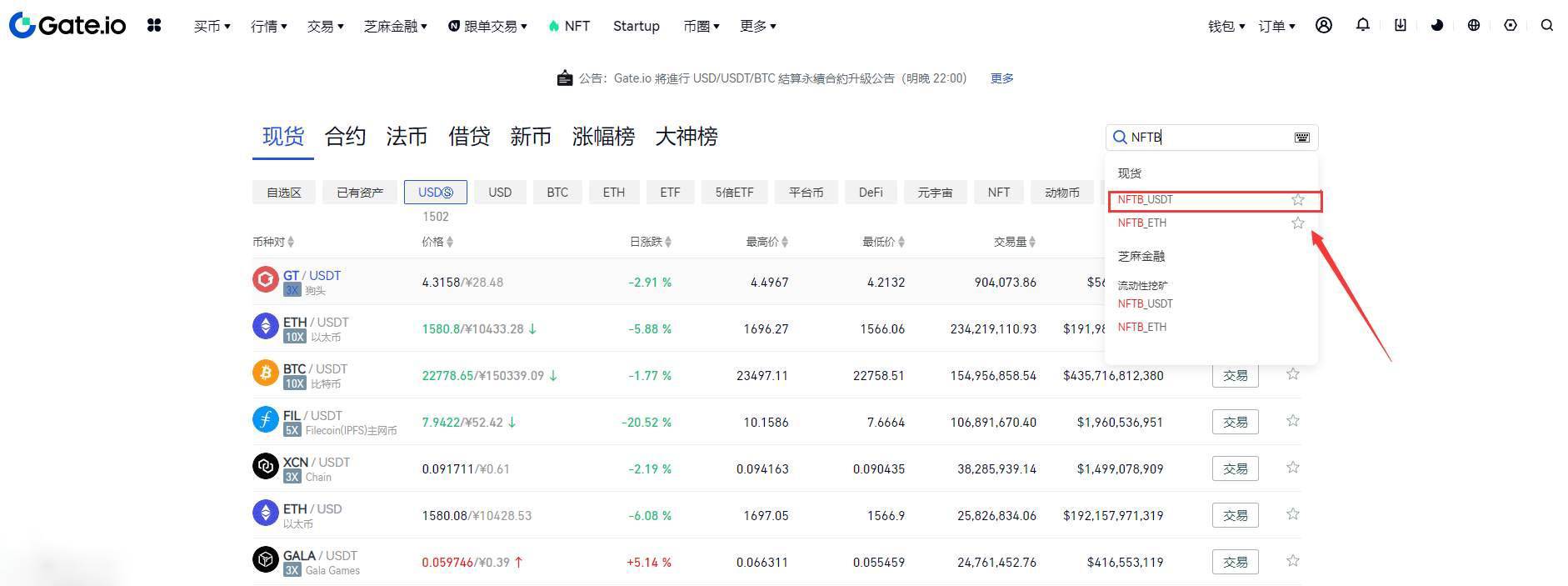 第三步:点击交易NFTB/USDT交易对,进入购买页面