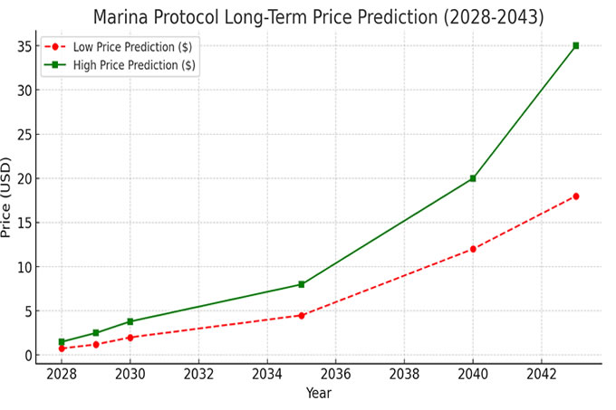 到 2043 年,Marina Protocol 可以达到 35 美元以上,前提是持续采用和技术进步推动其价值。