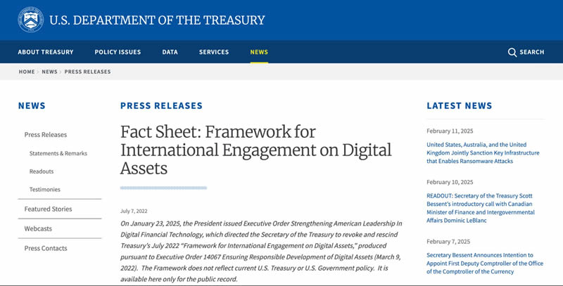 新命令正式撤销了拜登政府于 2022 年 3 月 9 日发布的第 14067 号行政命令,以及财 政 部于 2022 年 7 月 7 日发布的《数字资产国际合作框架》。