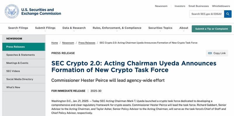 美国证券交易委员会(SEC)宣布成立加密货币工作组,该工作组由财 政 部长、司 法部 长、SEC主席、商品期货交易委员会(CFTC)主席等高官组成,并由人工智能和加密货币特别顾问戴维·萨克斯(David Sacks)担任主席。