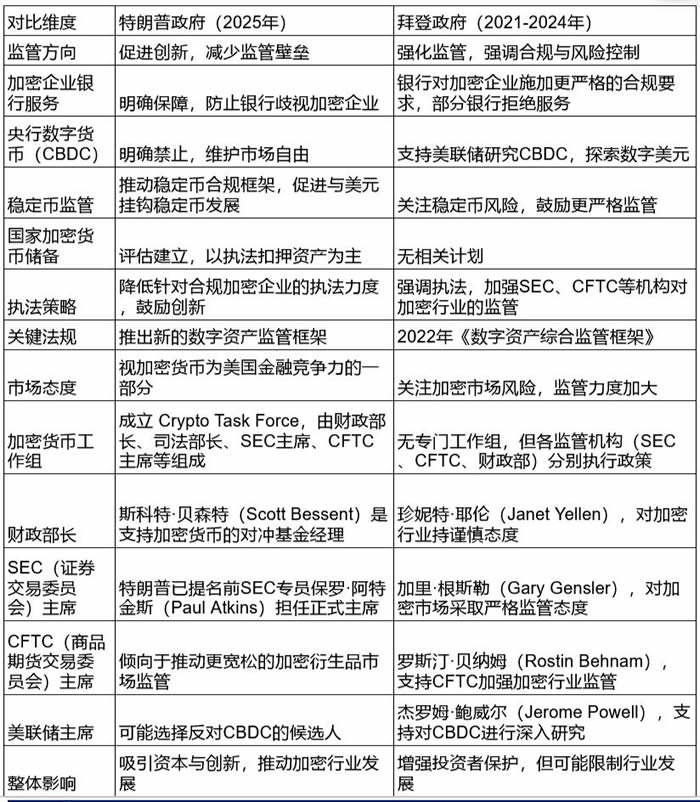 特朗普政府的政策方向倾向于支持加密货币行业发展,减少监管障碍,并通过关键任命确保政策的顺利执行。而拜登政府则侧重于强化监管,强调风险控制,其关键任命的官员普遍对加密货币持谨慎或严格监管态度。