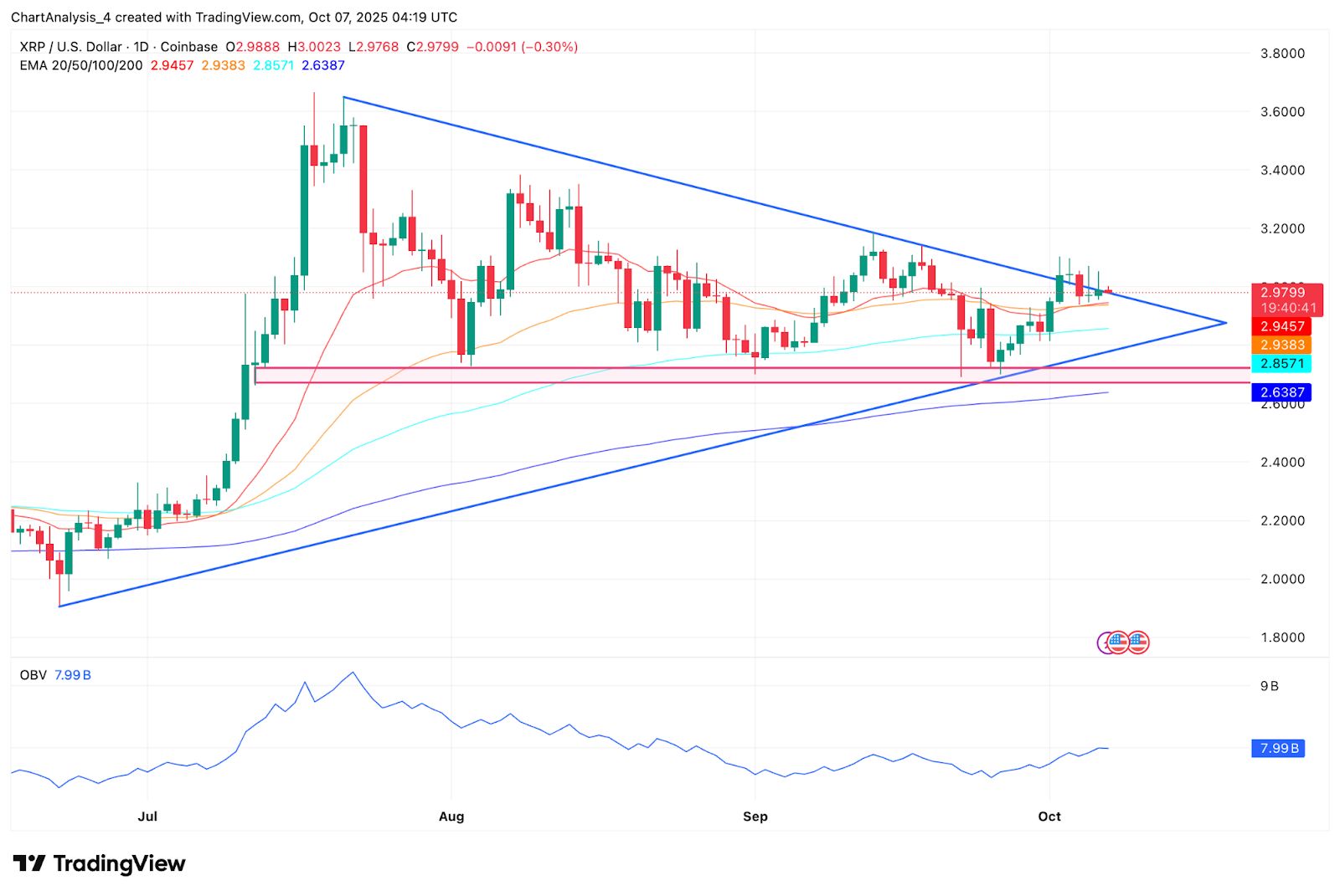 XRP (CRYPTO: XRP) 今日价格接近 2.98 美元,如日线图所示,在收紧的对称三角形形态内盘整。该代币继续守在 2.85-2.88 美元的关键支撑位上方,而阻力位仍位于 3.10-3.20 美元附近。交易员们正密切关注技术面的压缩,以及新一轮的链上资金流入和政治信号,这些因素为市场注入了新的乐观情绪。