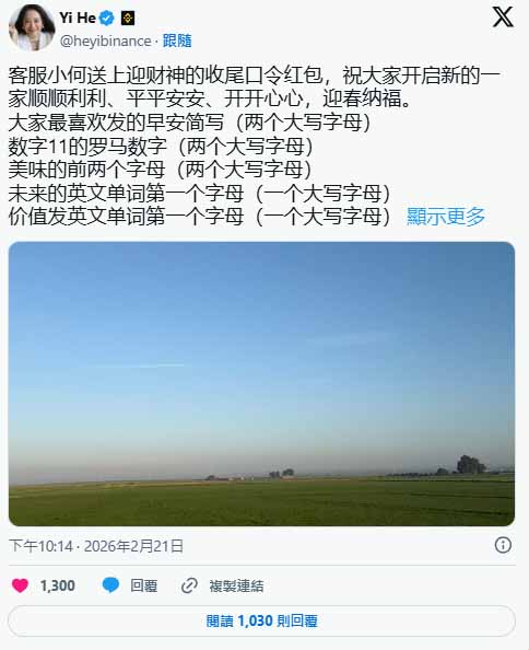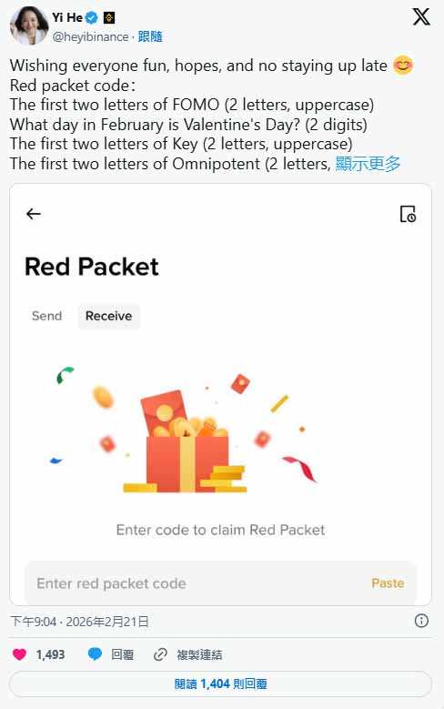进入 2026 年农历新年期间,何一再次通过 X 发布红包活动贴文,向社群送出新年祝福与红包密码,引发大量转发与交互讨论。