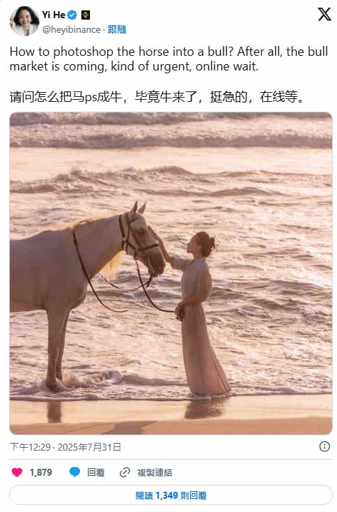 配上她本人牵着一匹白马站在海滩的照片,并用中英双语补充「在线等」的急切感,让人会心一笑。