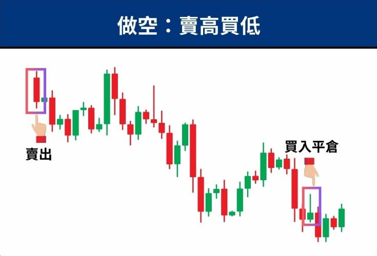 - 做空:透过卖高买低获利,投资人会先卖出来进行做空,因此后续平仓就是买入。
