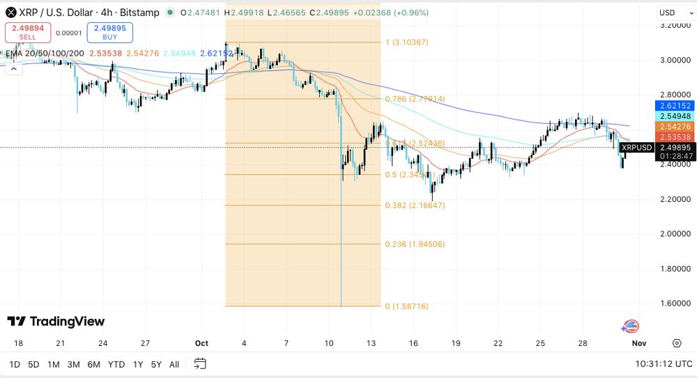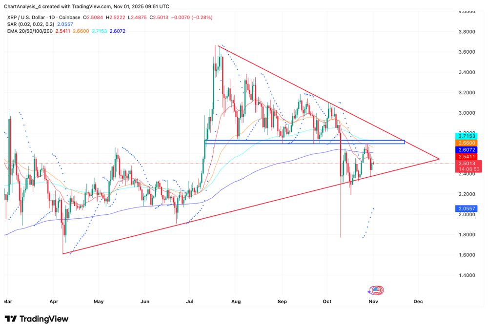 XRP价格走势依然紧张,目前在2.49美元附近交易,显示出在潜在突破前区间震荡的迹象。进入11月,关键价位依然清晰可见。