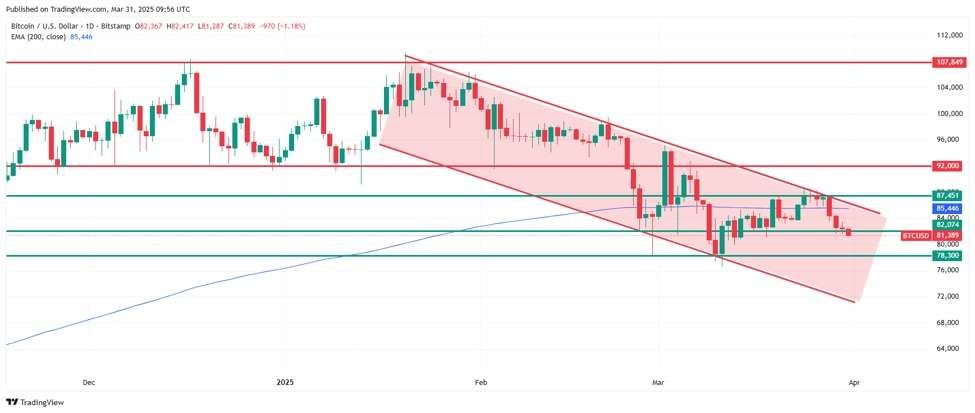 而根据比特币日线图,比特币未能克服局部阻力,并进入了一系列连续的看跌日。在过去四个下跌日中,比特币的价格下跌了6,000 多美元(7%),并在2025 年3 月31 日星期一测试了81,287 美元的水平——这是自3 月14 日以来的最低水平,标志着两周多的下跌。