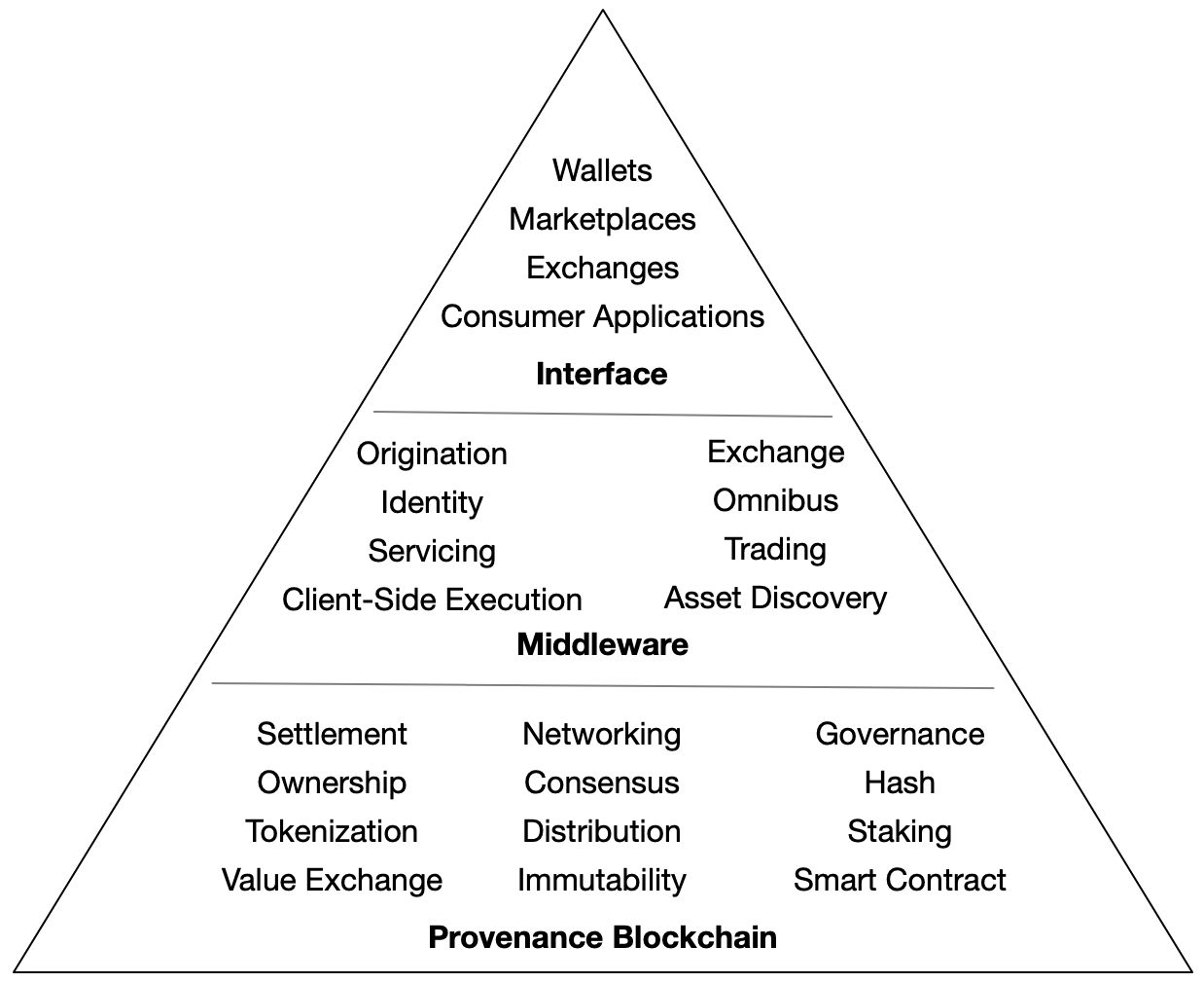 为降低开发人员门槛,Provenance 构建了一个清晰、直观的应用程序架构。它由三个定义明确的层组成:面向用户的界面、实现应用程序业务组件的中间件,以及支持更高层复杂要求的基础设施。其中,Provenance 区块链是整个架构的核心,它负责提供网络层、共识层、价值交换、结算、智能合约和网络节点等功能。