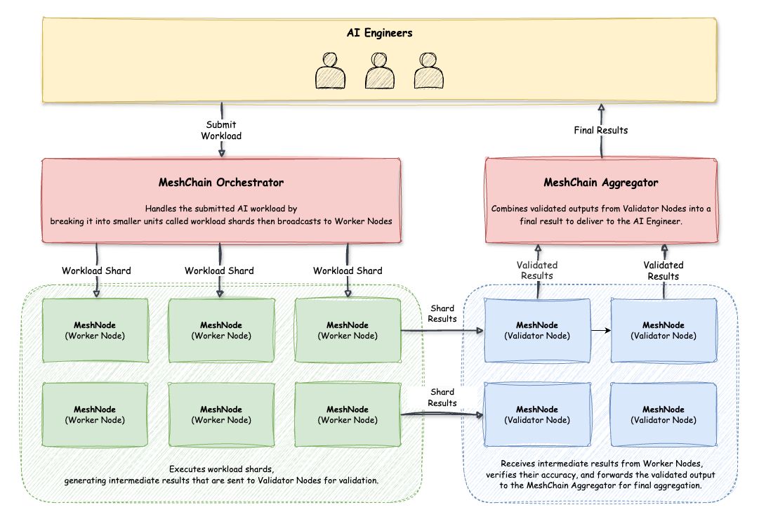 当 AI 工程师提交任务(例如训练机器学习模型)时,MeshChain 的协调器会将任务拆分成多个小块,并将这些小块分配给网络中的工作节点(Worker Nodes)。这些节点独立处理分配的任务碎片,并生成中间结果。随后,这些结果会被发送到验证节点进行审查。验证节点的作用是确保所有计算结果的正确性与可信性,防止错误或恶意行为对系统造成影响。