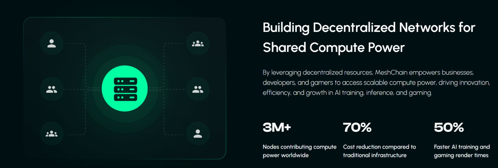 Meshchain 提供了一种高效且经济的解决方案,替代传统的集中式云服务,广泛适用于从人工智能开发到企业级数据处理的各类行业。